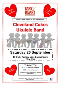 The next committee meeting takes place at Coulby Newham at 1:30pm on Monday the 13th of January. All members are welcome to attend. All members are welcome to attend our committee meetings. Come along and offer your support at our Annual General Meeting. All members are welcome to attend. All members are welcome to attend our committee meetings. Come along and bring all your friends for refreshments, home-baked treats and sales of books, DVDs, CDs and other things and a tombola. All members are welcome to attend committee meetings. The Tees Heritage Walk is a sponsored walk organised by Erimus Rotary Club and benefitting Take Heart Support Group. Your class tutors will have forms for you to indicate if you'd like to take part and which of the "out and return" walks you'd like to do. They range from 1 mile up to 12 miles. Sponsorship forms will be provided nearer the event. Come along on the 11th of June at 7 o'clock for an evening's entertainment at Guisborough Football Club with The Seasonal Singers, enjoy pie and peas and a raffle to raise money for Take Heart Support Group. The next committee meeting will be held at Coulby Newham on the 13th of October at 1:30 pm. All members are welcome to attend.